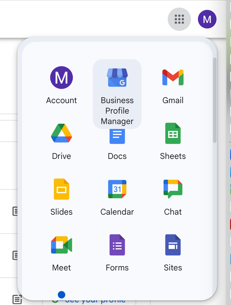 Make sure you are logged into the google account you use to manage your profile. Then click on the 9 dots next to your profile circle image in the upper right corner: